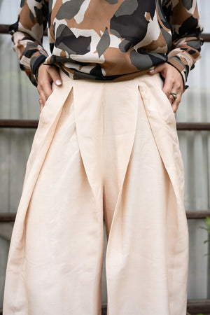 Paired with pleated pants, this set is perfect for sunlit afternoons and rooftop evenings alike, embodying the perfect blend of laid-back charm and refined elegance.