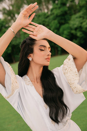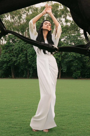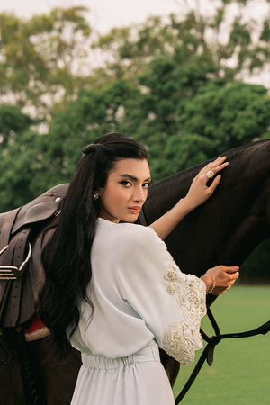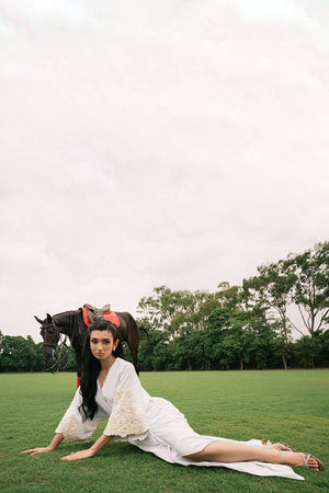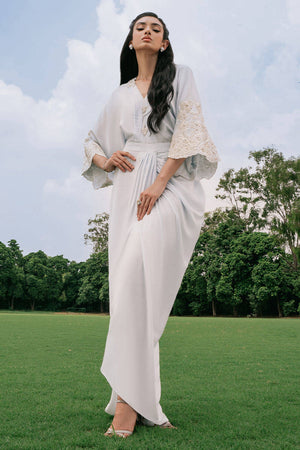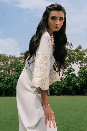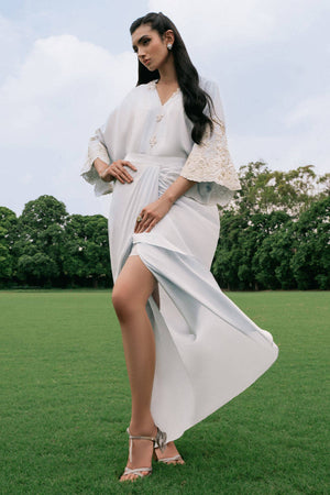 This elegant ice blue dress is visually striking, featuring contrasting white embroidery and intricate embellishments on the bell sleeves. It is completed with detailed pleats that enhance the overall appearance of the dress.