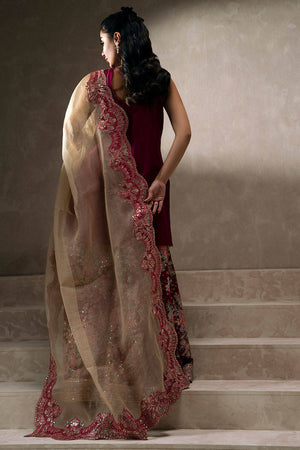 An eye-catching Zainab Salman signature hot pink pure raw silk short shirt featuring a meticulously embellished neckline that imparts a regal allure. To complement the opulent neckline, the ensemble is paired with a richly embellished and embroidered sharara, accentuated by intricate borders. The outfit is further enhanced by a contrasting organza dupatta, which boasts a lavishly embroidered scalloped design along all four edges, adding a touch of sophistication and completing the ensemble with elegance.