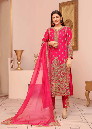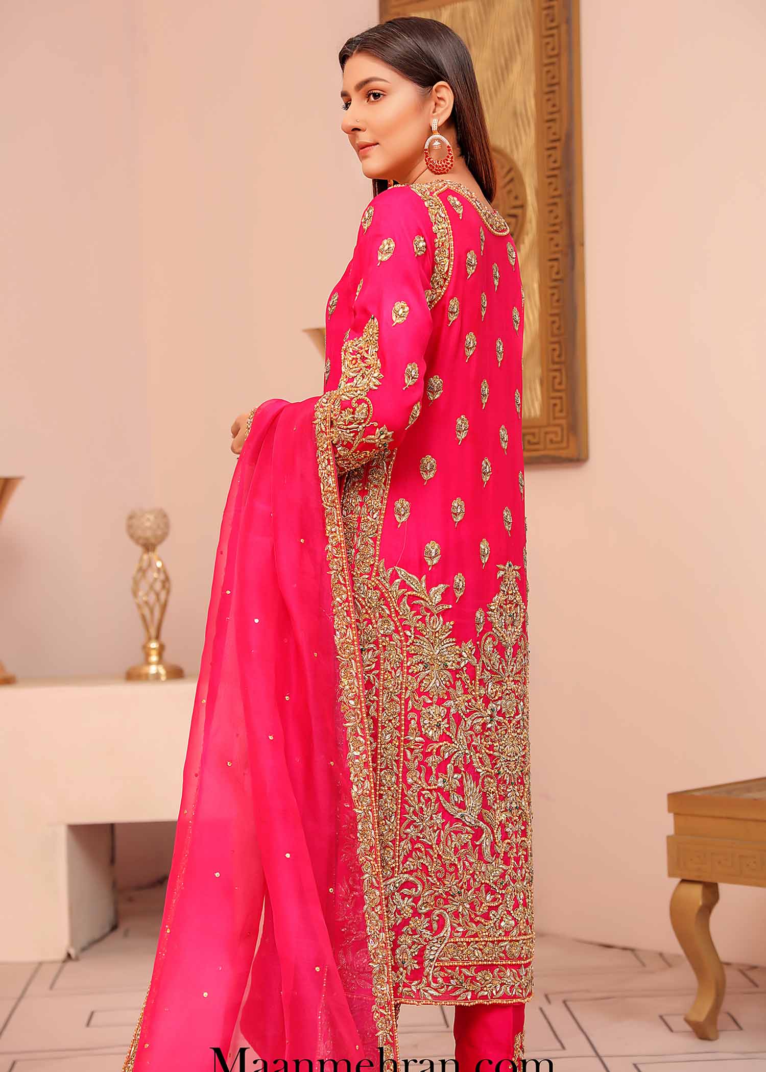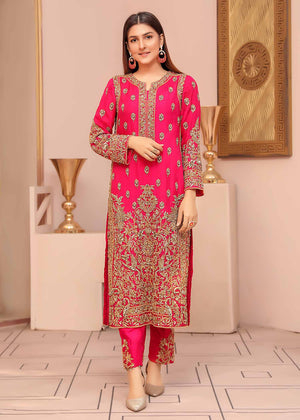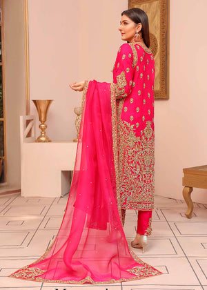 Description: A starking fuchsia creating a luxurious look with delicate zardozi work on the border and theneckline. Rich gold hues lifting the royalty of the garment, scatter of 3D gold embellishments that perfectly complement each other to create an ornate and statement piece. With festivities around the corner this classic piece can be dressed up for a ravishing look with bold jewellery, paired with pure raw silk pants and a flowy organza four sided boarder dupatta.