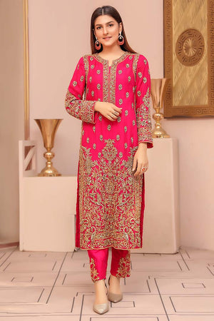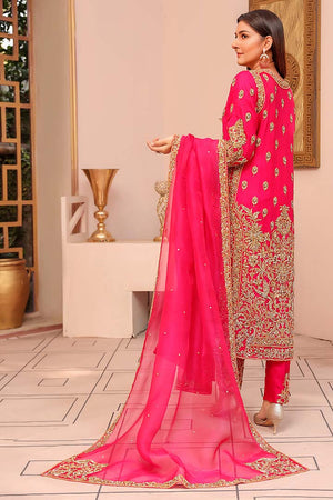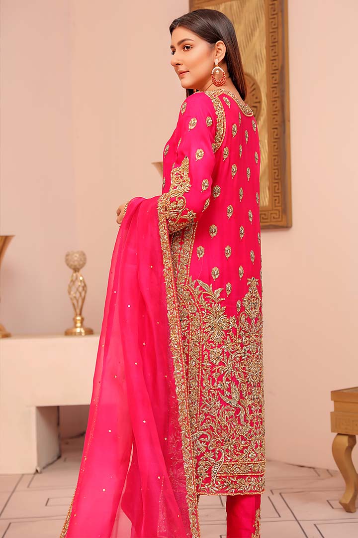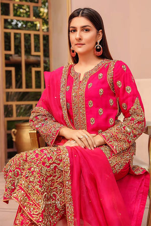A starking fuchsia creating a luxurious look with delicate zardozi work on the border and theneckline. Rich gold hues lifting the royalty of the garment, scatter of 3D gold embellishments that perfectly complement each other to create an ornate and statement piece. With festivities around the corner this classic piece can be dressed up for a ravishing look with bold jewellery, paired with pure raw silk pants and a flowy organza four sided boarder dupatta.