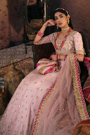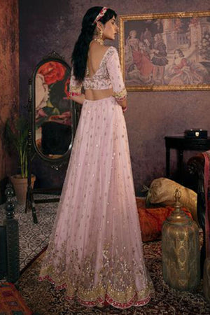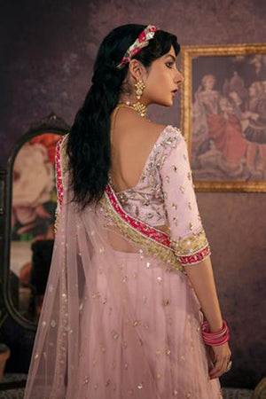 A fleared multi panel gathered lehnega is deliciously rendered in baby pink cobweb tulle and exquisitely adorned with intricate thread work. Fabric for choli is net fabric with hand embellishment on front, back and sleeves with sheesha , kora, dabka, sitara, beads, pearls and sworvskis. Jamavar fabrics of two colors (hot pink and mint) are used on sleeves as borders to make a contrast. Lavishly scattered with seed pearls, this illuminating ensemble is the perfect dainty and feminine look for summer weddings.Fabric: Net