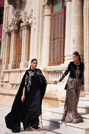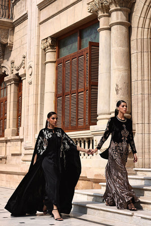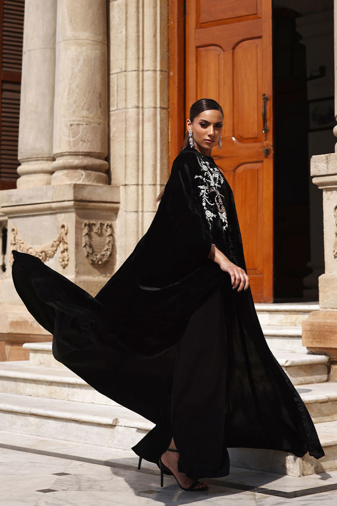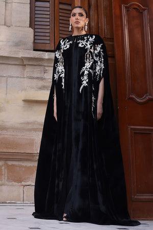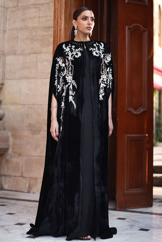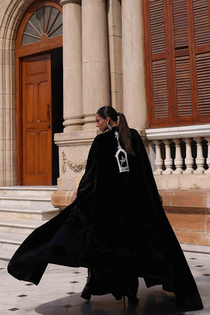 This exquisite black velvet cape is a masterpiece of craftsmanship. The front and back are adorned with intricate zari embroidery and delicate cutwork, enhanced with silver zari, lorex, white resham, and rose gold handwork motifs. Sparkling stones and handcrafted patels add a luxurious, dimensional finish. Designed with a cotton charmeuse inner lining for comfort, this piece seamlessly combines elegance, artistry, and sophistication.