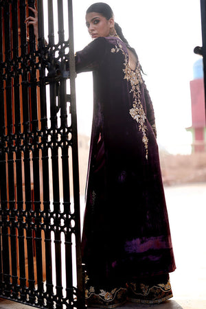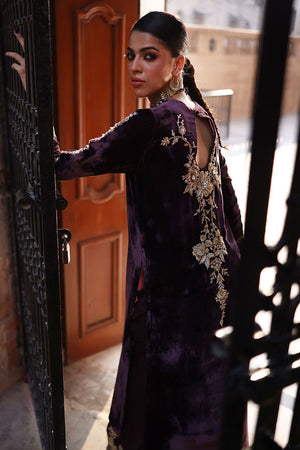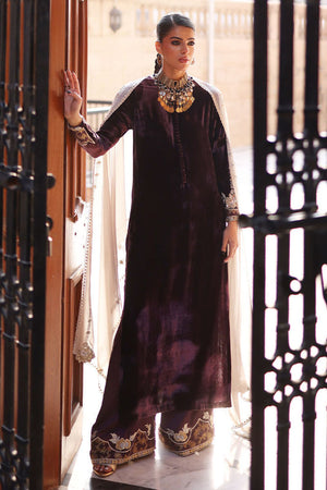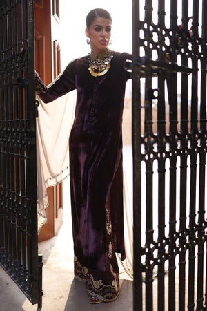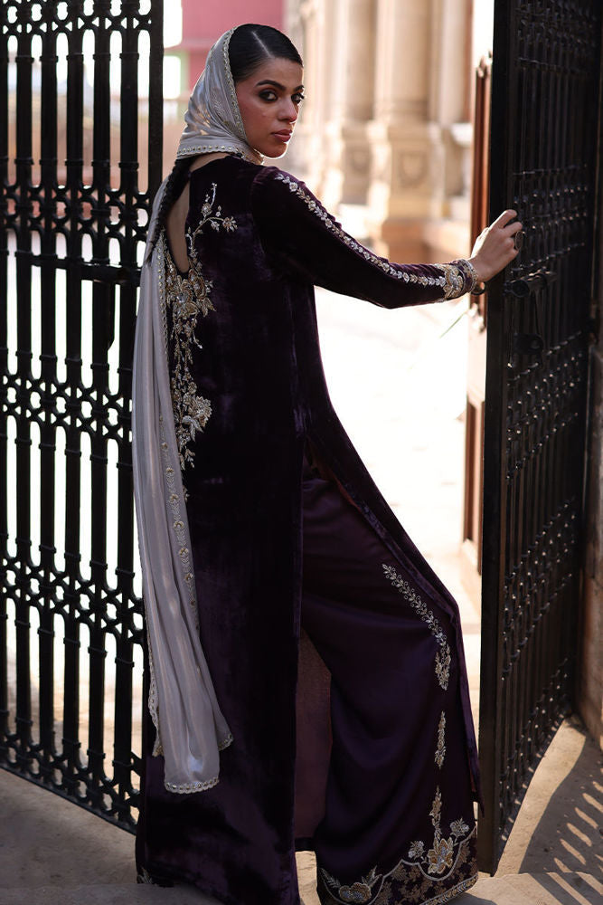 A timeless straight long shirt crafted in luxurious pure velvet, adorned with silver and gold zari embroidery and heavy zardozi work. The intricate embellishments—kora, dabka, cutdana, stones, pearls, nakshi, and sequins—grace the front, back, and sleeves, reflecting refined craftsmanship. Paired with cotton charmeuse culottes featuring silver and gold zari, lorix embroidery, and Banarasi appliqué, adding depth and detail. The ensemble is completed with a fog beige lame chiffon dupatta, delicately embroidered in gold, silver, and lorix, creating a perfect balance of elegance and sophistication.