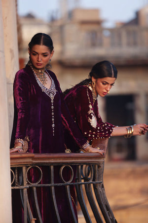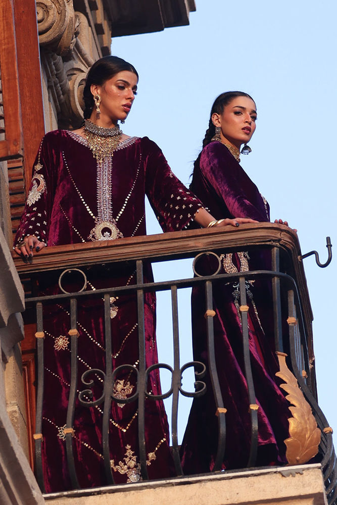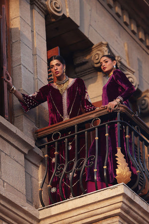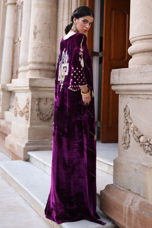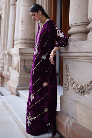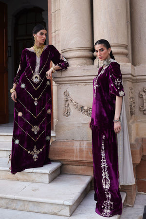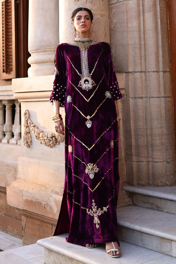 An elegant kaftan in rich magenta pure velvet, designed with side pockets for a contemporary touch. The piece features exquisite gold and silver zari embroidery accented with colored appliqué work, elevated by intricate handwork of sequins, cutdana, dabka, naqshi, tikki, and stones on the front, back, and sleeves. The gota balls delicately hanging from the sleeve edges add a playful yet sophisticated charm. Paired with cotton charmeuse culottes or pants, this ensemble beautifully merges modern design with timeless craftsmanship.