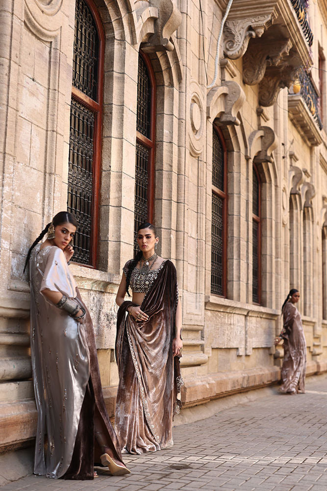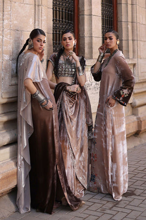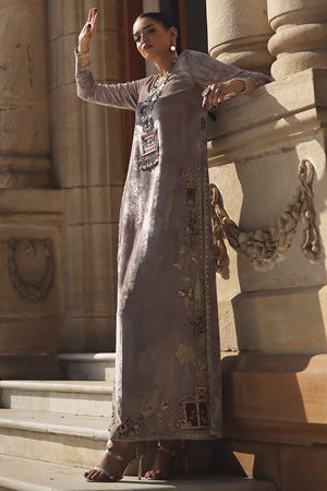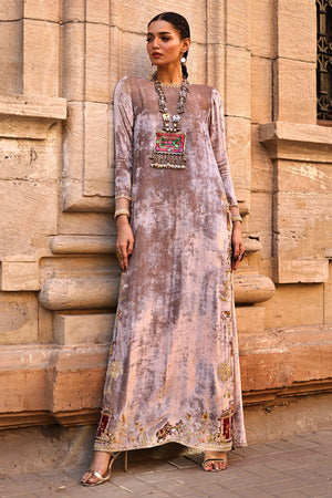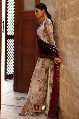 An exquisite straight long shirt crafted in pure velvet, rendered in a graceful stone taupe hue. The design features Mughal-inspired digital motifs, beautifully accentuated with colored resham and zari embroidery, and enriched with intricate zardozi work including kaamdani, stones, sequins, dabka, nakshi, moti, and cutdana on the front, back, and sleeves. Paired with cotton charmeuse pants for a refined, contemporary touch. The look is completed with a pure velvet shawl in deep maroon, adorned with golden and antique sequin work, adding a regal contrast and timeless elegance to the ensemble.