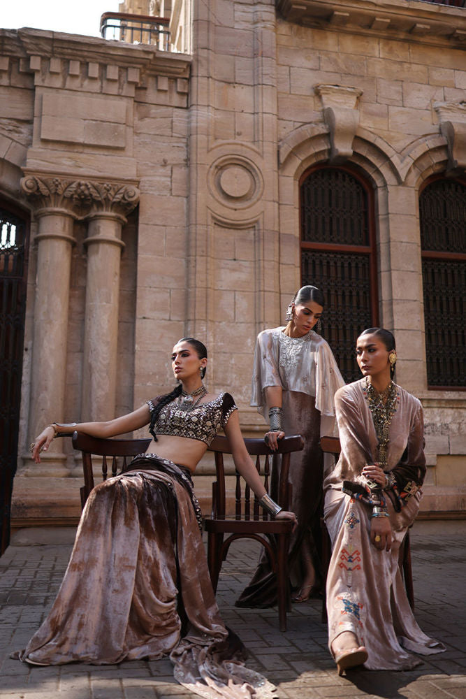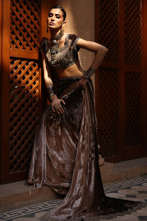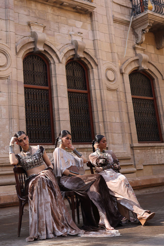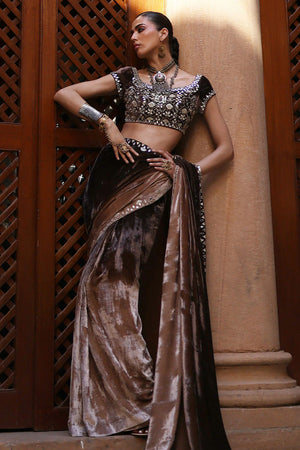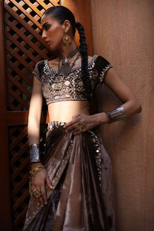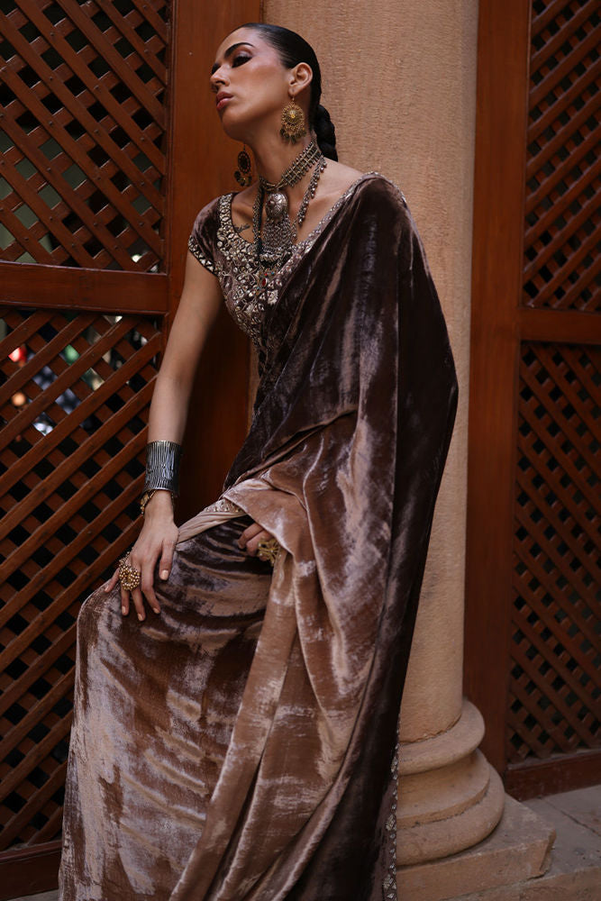 A luxurious saree crafted in pure velvet in a stunning pinewood ombre hue, adorned all over with mirror work. The ensemble is further enhanced with golden and silver zari and lorix embroidery, creating a rich, textured finish that exudes elegance and timeless charm.