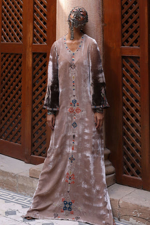 An elegant kaftan crafted in luxurious pure velvet, featuring side pockets for a modern touch. The design is adorned with colored appliqué work, complemented by colored resham, bronze zari, and lorix embroidery on the front, back, and sleeves, adding depth and sophistication. Paired with cotton charmeuse pants and culottes in matching beige, this ensemble blends comfort, contemporary style, and timeless craftsmanship.