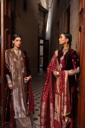 A Wood Smoke-colored Chogha-style shirt in pure velvet, intricately embroidered with gold, antique, and rose gold zari threads. The heavy zardozi work is a celebration of craftsmanship — featuring imported crystals, dabka, nakshi, stones, cutdana, sequins, and moti across the front, back, and sleeves. Completing the ensemble are cotton charmeuse culottes and a pure velvet shawl in rich mahroon, detailed with gold and antique sequins for a luxurious finish.