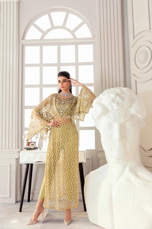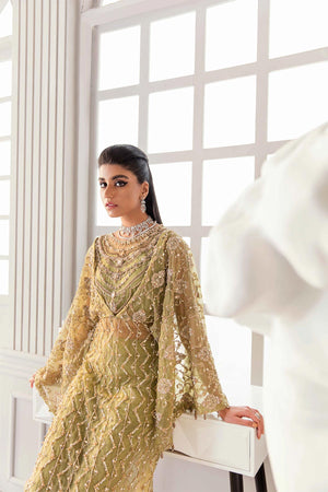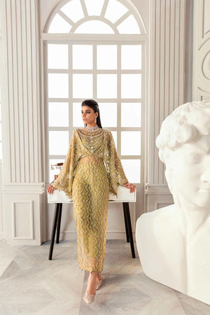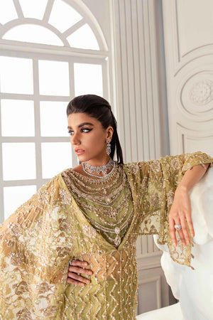 It's a complete 3 piece stitched outfit with shirt, slip and pants. Shirt is pure kathan organza with gold tilla and sequins work and a heavy jewel emblished neckline with pearls and sequins work allover. There are hangings on sleeves and ghayra. Outfit its paired with Korean raw silk trousers with gold tissue finishing, and separates slip made in PK raw silkFabric: Shirt: Pure kattan organza