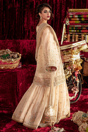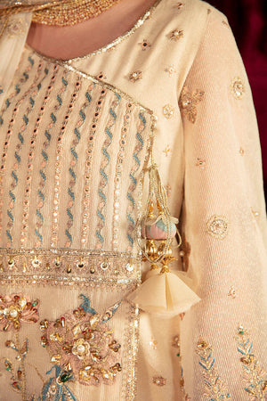 Gajra is our traditional chambeli hued gharara ensemble. The top is an agarkha featuring delicate thread embroidery, gotta and beadwork accents done in the pattern of elegant floral vines done in pretty pinks and blues. The gharara done in karandi silk features gold motifs all across and beautiful metallic borders running across the hemline. It is paired with a matching organza dupatta also featuring metallic motifs and pretty embroidered border across all 4 sides.