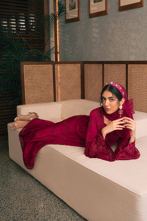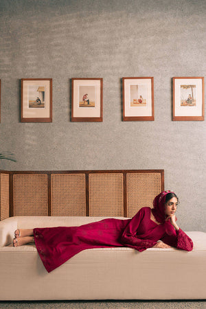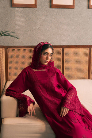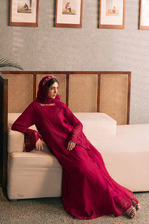 Immerse yourself in the radiant elegance of Mohsin Naveed Ranjha's "Garnet Glow" from the Chaye Coffee Luxury Pret Collection. This ensemble, in a sumptuous hibiscus red hue, features a long raw silk box-pleated flared shirt adorned with intricate floral embroidery and eyelets, complemented by a pleated V-neckline. The hemline is trimmed with delicate lotus flower embroidery, while the sweeping long sleeves showcase exquisite embroidery and cutwork with a lotus motif. Paired with raw silk cigarette pants and a pure chiffon dupatta, all pieces are meticulously crafted in the same coordinating color, and finished with elegant trims.