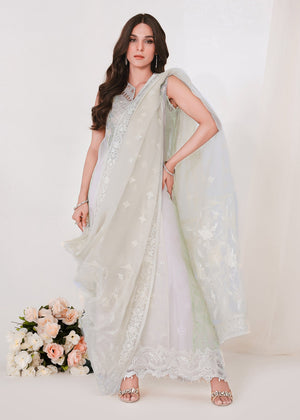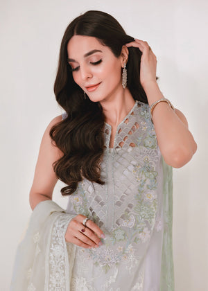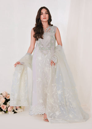 The shirt showcases a meticulously embroidered pattern with an embellished cut work neckline, elevating its beauty and making it a perfect choice for formal occasions. The organza dupatta, adorned with intricate embroidery, adds a touch of luxury and grace to the ensemble. The PK raw silk pants complete the look, providing a comfortable yet stylish fit.