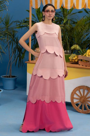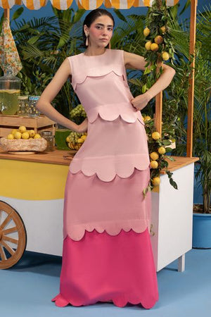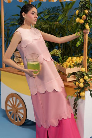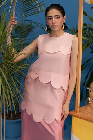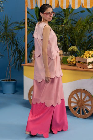 This exquisite ensemble features a long shirt crafted in delicate pink hues, seamlessly blending blush, rose, and soft berry tones for a romantic tonal effect. The highlight of the design is the intricate scalloping technique used along the hem, neckline, and sleeve edges creating beautifully curved, lace-like finishes that add a touch of elegance and softness.The overall silhouette flows gracefully, while the thoughtful placement of scalloped detailing enhances its femininity and craftsmanship. Ethereal, refined, and artistically constructed, this outfit is a perfect blend of modern grace and timeless charm.