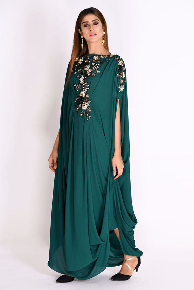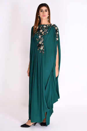 Effortlessly modern emerald green double Georgette cowl Kaftan features floral chantilly motifs with accents of sequins, pearls, beads, cut dana, stones and chantilly net.