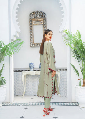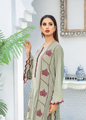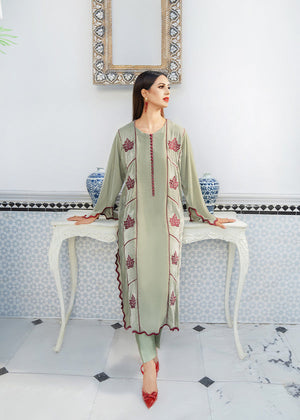 Be sure to turn heads in this cool, sage green velvet kurta. It has bold deep red embroidery with exaggerated buttons. Its paired with matching pants.
