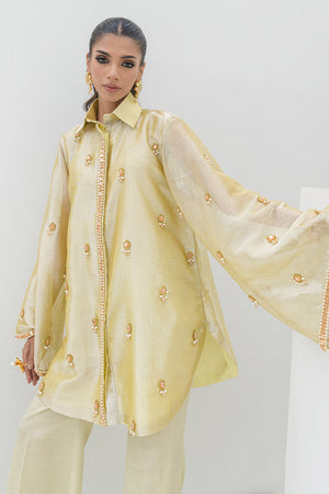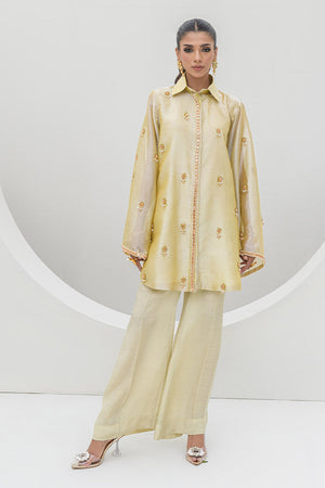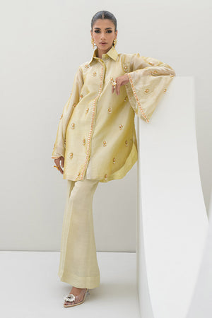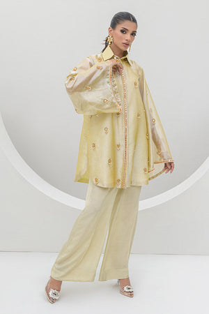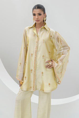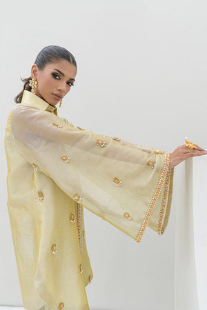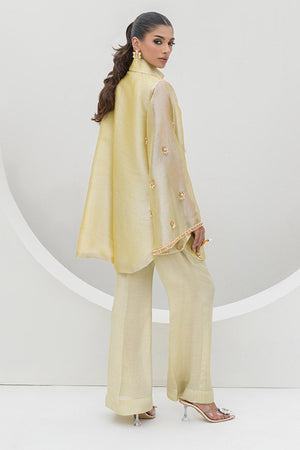 This eye-catching short jacket in a soft lemon hue is sure to turn heads. It is fully embellished with exquisite handwork featuring kora, crystals, and pearls, and is paired with stylish boot-cut pants. The model is wearing a size small, and the length of the jacket is 32 inches. Please note that this jacket has a loose cut, so its measurements may differ from the standard size chart.