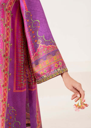 Step into timeless elegance with this exquisitely designed two piece ensemble pure raw silk long shirt in a rich violet hue. Featuring a perfect fusion of traditional digital prints, fine thread embroidery, and sparkling diamanté embellishments. The design is beautifully accented with traditional patterns along the neckline, sleeves, and hem, creating a luxurious ethnic appeal.The ornate neckline and detailed border accents elevate its sophistication, making it ideal for festive dinners or intimate celebrations..