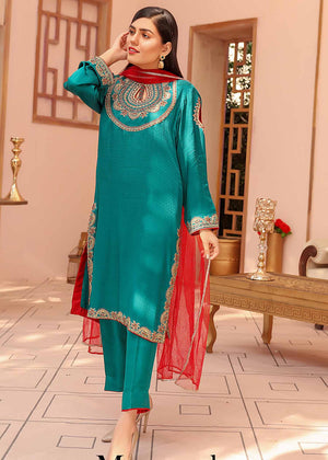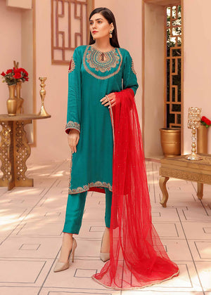 Description: Ignite in our beautifully handcrafted full sleeved teal shirt with an intricately embellished neckline, ornamented with stone work. Paired with sleek ankle length pure raw silk pants and a contrasting red dupatta.