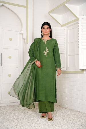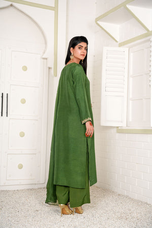 Sumptuously adorned neckline and sleeves using dabka, pearls and sequins over a sirocco colored canvas is an ethereal attire accompanied by silk dupatta and trousers.