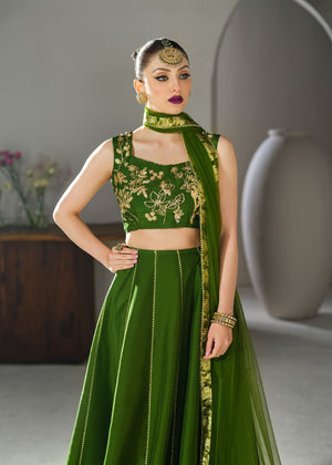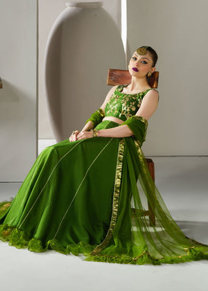 This stunning outfit features a hand-embellished choli, meticulously crafted with intricate kora and dabka work. Paired with a lehnga adorned with gold kingri and a net dupatta with beautiful badla finishings and frill, Gizelle is the epitome of elegance and grace. Get ready to make a statement and turn heads with this exquisite ensemble!