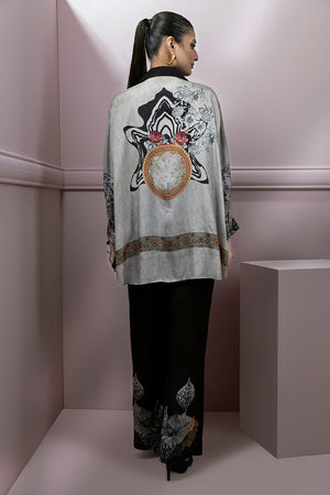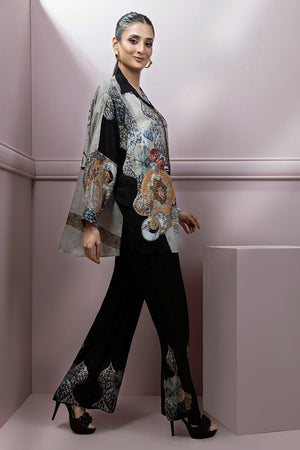 V-neck buckle shirt styled with printed pants. Shirt has detailed thread floral embroidery on centre of shirt with zari hint. Looks best for an official event, evening parties, local and international wear. Bag can be added seperately as per customer request.