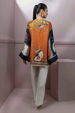 Funmood is the new style. The structured jacket style top in bright prints of blue, rust and ivory. Embellished with antique gold embroidery and handworked jewel motifs paired with ivory pants. Comes with and without the belt as per customers requirement.