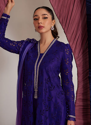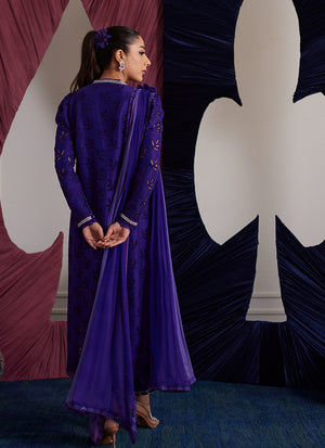 This indigo three-piece outfit exudes sophistication and glamour, crafted from pure raw-silk schiffli. The shirt features a beautifully embellished neckline, adorned with diamanté and sequins for a subtle yet captivating sparkle. The puff sleeves are similarly embellished around the cuffs, adding a touch of refined detail and enhancing the overall elegance of the design. The chiffon dupatta is dyed in three stunning shades of purple, creating a gradient effect that perfectly complements the indigo tone of the shirt. It is secured with a hand-embellished corsage and finished with an intricate embroidered border, elevating the ensemble's luxurious feel. The izaar is equally exquisite, featuring a matching border embellished with diamanté and sequins, tying the look together with a cohesive, dazzling finish. This ensemble blends intricate details with timeless elegance, making it an ideal choice for any formal occasion
