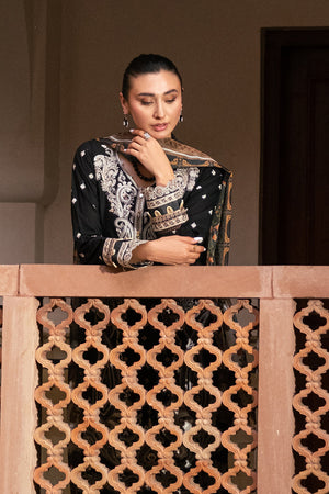 Our majestic masterpiece Gloria has resplendent floral tapestries unfold its dark expanse evoking a vibrant symphony of ivory, brown color that create an alluring impact. Paired with a sumptuous silk dupatta illustrated with an abstract mélange of florals depicting vivid hues, this striking design embodies elegance and a timelessly captivating design sensibility. This regal outfit has embroidered border on the trousers that effortlessly captivates all attention.