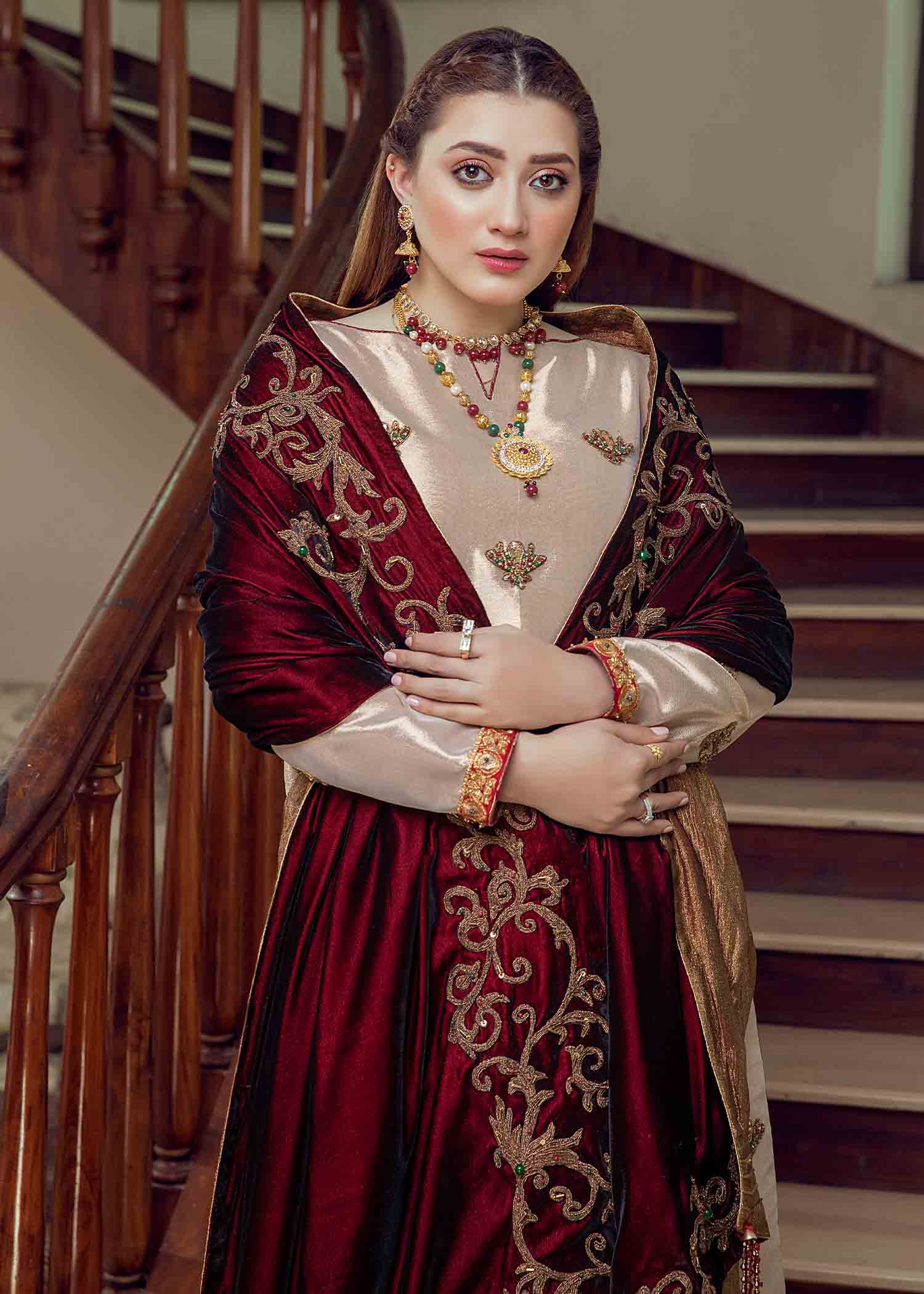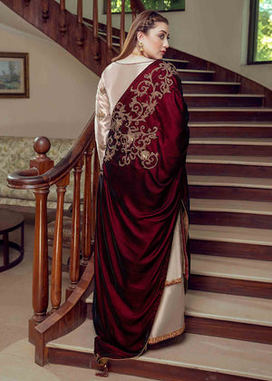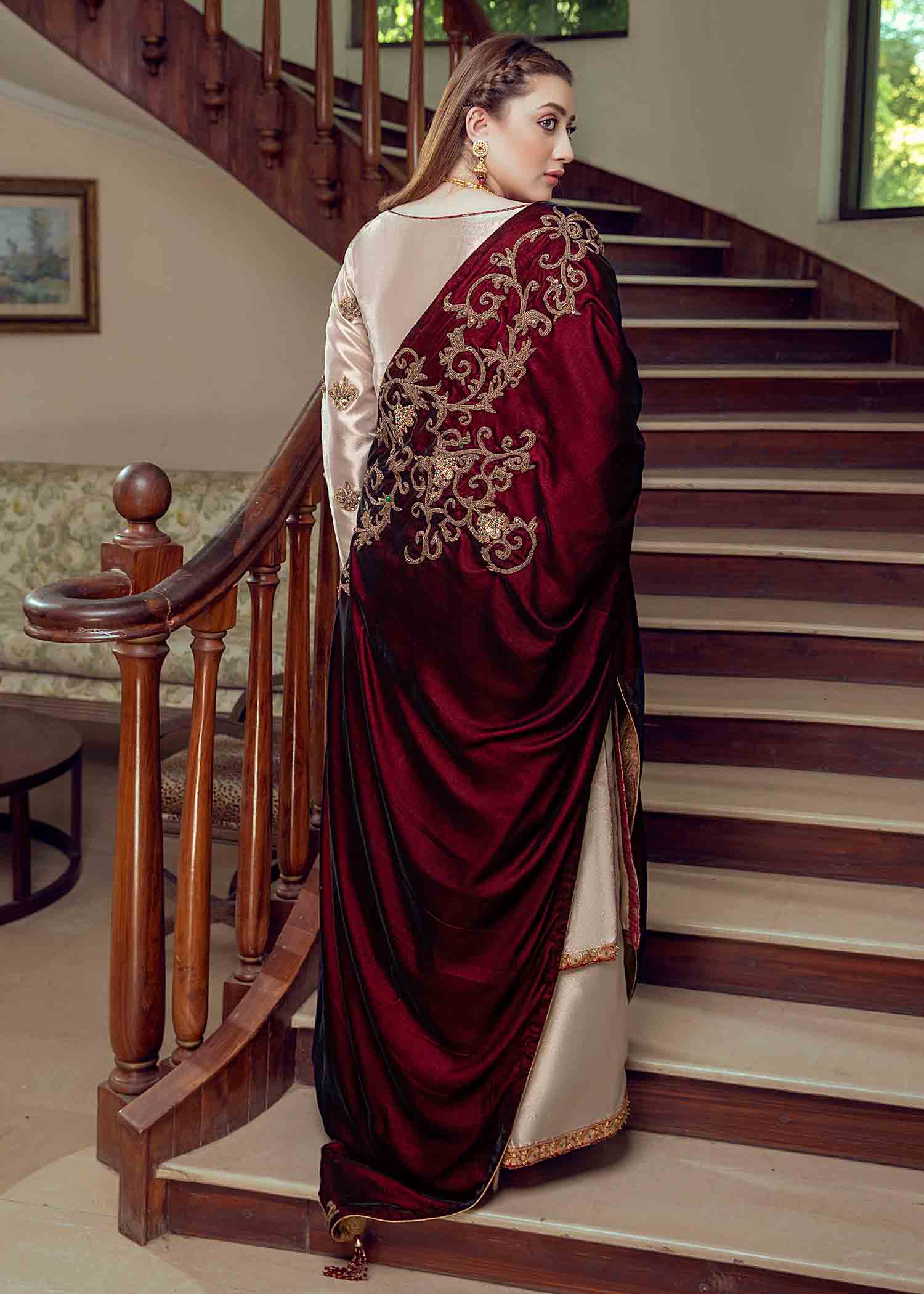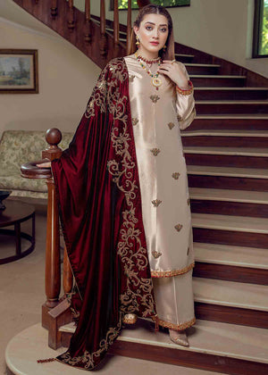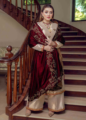 Description: Perfect for our newly-wed bride this season, style yourself in this pure tissue straight long shirt and flared pants. A delicate shade of dull-gold is chosen for the shirt and pants with hand-embellishment of semi-precious stonework . Pair the look with our pure double tone velvet shawl embellished with semi-precious stone and dori work, lined with crushed tissue.