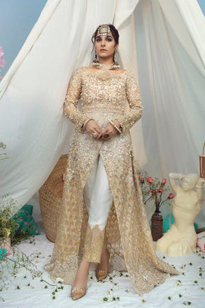 Commemorate the magic of idyllic festivities in this formal wear made in gold blush tulle which is a true epitome of grace and glamour. The intricate hand embellishments of gold tilla, sequins and pearls make this a statement peace. It is paired with raw silk pants which add the oomph to the whole look. The look is finished with a hand embellished belt wrenched at the waist.Color: Gold