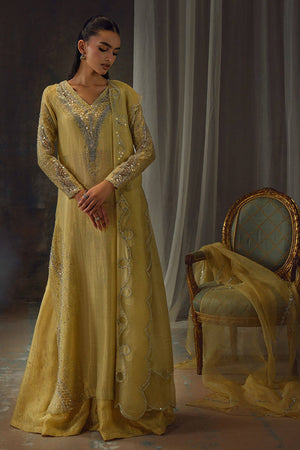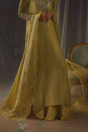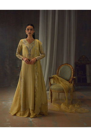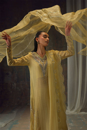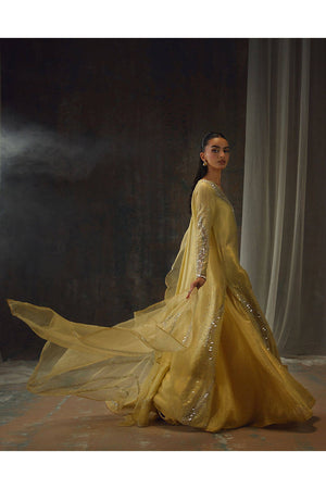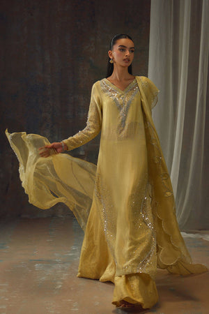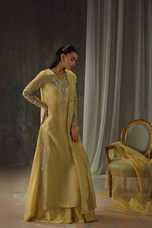 Bathed in a soft golden hue, and crafted from luminous zari net, the fluid silhouette is brought to life with meticulous hand embellishment. The shirt glistens with intricate detailing, while the lehnga mirrors the same artistry, creating a harmonious shimmer with every step. Can be paired with an airy organza dupatta adorned with delicate handwork for a light, ethereal finish, or a richer pure silk-and-organza blend, also hand-embellished, for a more modern drape. For a modern twist, the look can be paired with wide-leg pants, transforming this timeless piece into a statement of contemporary sophistication.