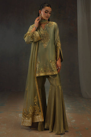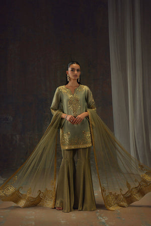 Bathed in the warm glow of antique gold, the lustrous tissue gives the outfit a regal sheen. The shirt is adorned with exquisite gota work, its intricate patterns gracing the neckline, sleeves, and hem in a harmonious display of craftsmanship. The flared sharara pants echo the same rich tones, enhancing the grandeur of the silhouette. The net dupatta, with heavy yet intricate gota embroidery and brocade corners, completes the look—an opulent choice for weddings where heritage meets high elegance.