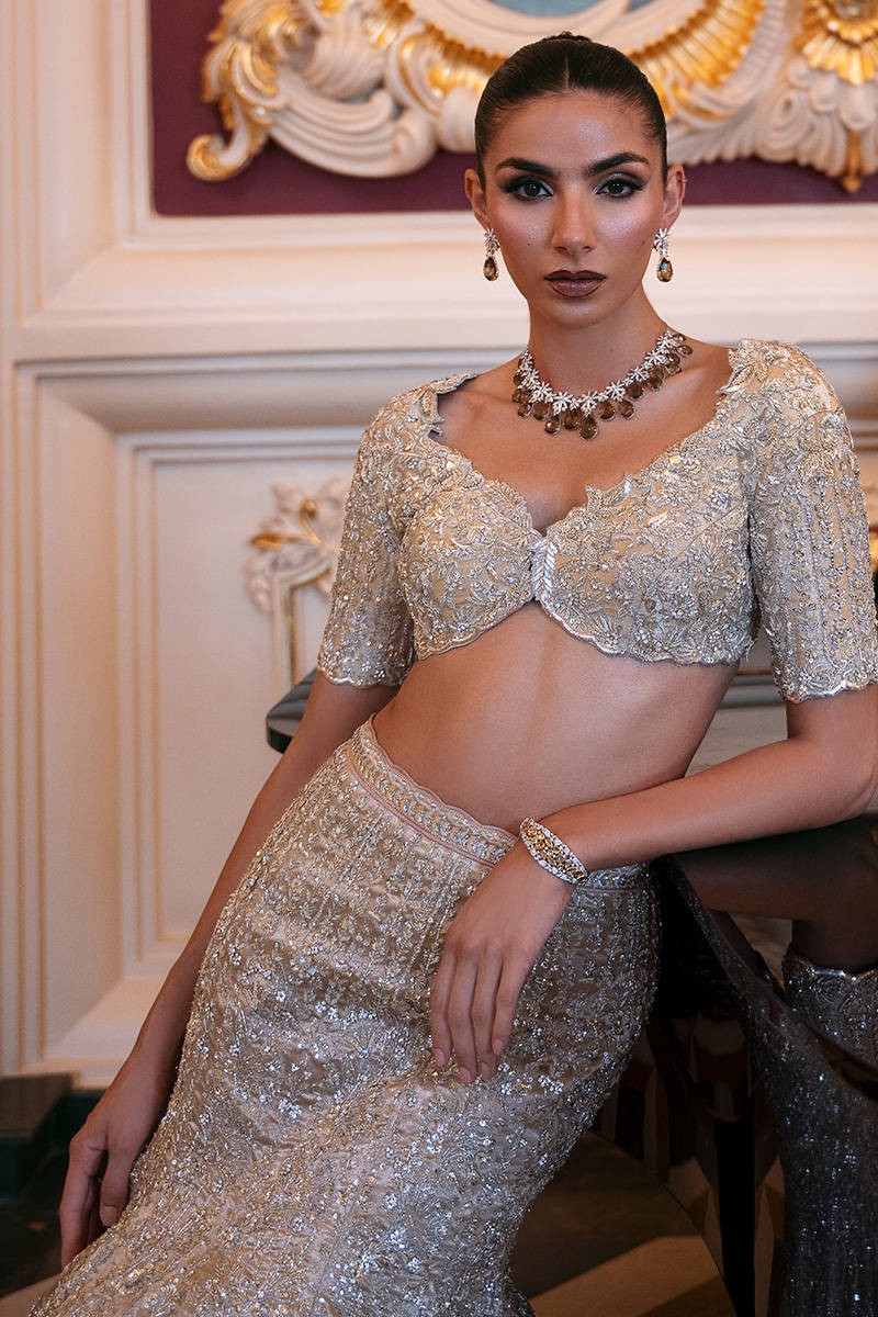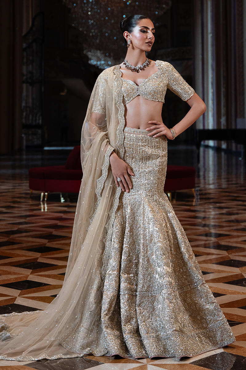 An opulent gold mermaid lehenga choli, crafted from pure tissue fabric and adorned with breathtaking hand embellishments, designed to create a timeless bridal statement. The lehenga is beautifully detailed with intricate embroidery and Swarovski crystals, shimmering with every movement. The choli features a graceful sweetheart neckline and classic Indian sleeves, meticulously hand-embellished to perfection. Paired with a delicate net dupatta, finished with scalloped borders intricately worked in dabka and crystals, and sprinkled with sitara chan all over, the ensemble radiates elegance and grandeur, perfect for the modern bride.