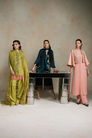 Goldie - a breath-taking ensemble in a delicate dull lemon green hue, crafted to embody effortless sophistication. Featuring a relaxed mid-thigh tissue silk shirt with a graceful boat neckline, adorned with exquisite floral embroidery and a chatta patti embroidered border, further enhanced with 3D floral motifs for a timeless touch. Paired with a desi-cut Thai silk shalwar, delicately finished with lace detailing, and a foil-printed organza dupatta, Goldie is the perfect blend of tradition and contemporary charm.