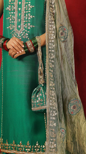 A scintillating pure raw silk green sharara set rendered using intricate work techniques including gota work. The duppata is hand loomed on silk tissue fabric featuring banarsi patchwork and gota details.