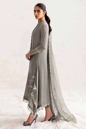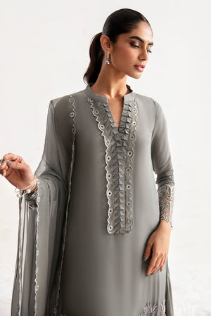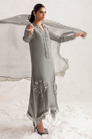 Square-cut shirt is a fusion of contemporary style and traditional elegance. It's accentuated by whimsical botanical zari work on the border, creating an captivating look. The neckline is a work of art, with fabric manipulation and delicate embroidery cutwork. The sleeves feature organza cuffs adorned with intricate floral embroidery, Pair the shirt with straight pants that showcase embroidery and cutwork details. Complete it with a chiffon dupatta featuring embroidered borders.