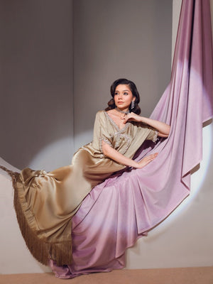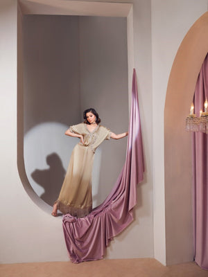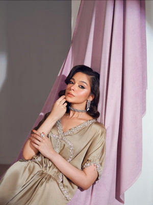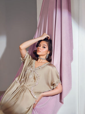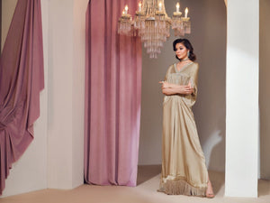 Stand out in the crowd with this one-piece stitched kaftan style outfit with fringes on the bottom . Charmingly designed in silk fabric and hand-embellished with silver 3d work on neckline and slightly on front and back to add an elegant touch to the outfit. It can be customized in any color.