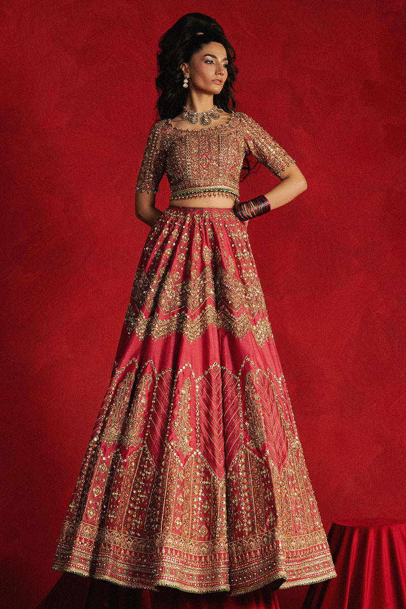 A garden in full bloom, Gul Badan iscrafted from rose pink Indian silk and soaked in old-school romance. The choli is short, with demure half sleeves dusted with judiciously placed mirror work and glints of metallic thread embroidery. The lehenga begins at the waist with chevron patterning and evolves into diamond-shaped panels, each box housing a Mughal floral motif rendered in a mix of silken thread embroidery, block print, and tiny mirrors that glint like dew. Beneath this garden of geometry, vertical scrolls rise like creeping vines embroidered delicately in lines that mimic antique architectural flourishes. The hem is finished with multiple embroidered borders that layer like sari pallus from a bygone era. A contrasting organza dupatta in lush green explodes with large, bold floral Mughal motifs in gota and adda work, framed in broad gold borders with embroidered trims running along all four edges.