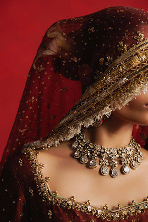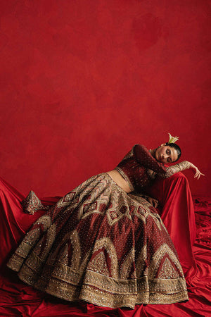 Begum arrives in deep maroon Indian silk, lavishly adorned with silk appliqués, block-printed motifs, and shimmering hand adda embroidery. The lehenga’s structured silhouette begins with a chevron pattern cinching the waist, then flows into diamond-shaped lozenge motifs meticulously embroidered in silken threads and mirror work. The hem flares into majestic Mughal arches niche-like in form are finished with twin borders of radiant golden embroidery and glittering embellishment that gleam with every step. The long-sleeved choli features angular cuts at the sleeve ends, reflecting the strong architectural shapes that define the ensemble. A sheer organza dupatta, scattered with a delicate spray of sequins and mirrors, floats like stardust, its four borders richly embroidered in gold and edged with traditional kiran trims that shimmer with movement
