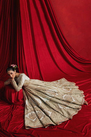 Gulé Jaan is dipped in the pale luminescence of icy blue Indian silk. The choli, long-sleeved with a graceful boat neckline, features a double-sleeve illusion and subtle structure, embroidered in golden thread with twinkling pearls that dangle at the cuffs like icicles on a window ledge. The lehenga is composed of angular silk appliqué panels stitched together like stained glass, each one enclosing a peacock motif picked out in sequins and zari. Across the expanse, palmette-shaped borders stretch in angular symmetry, embroidered in fine gold thread, leading to a finely decorated hemline that sparkles like snow caught in twilight. The organza dupatta, light as a frost-kissed breeze, is embroidered with soft flowers in silken and metallic threads, framed with a scalloped internal border and edged in traditional golden kiran