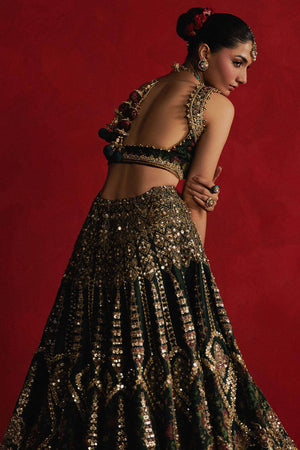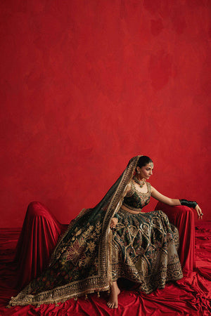 Gul-e-Khaas is something rare done in dark green Indian silk ensemble, bold and botanical, starts with a sleeveless choli in floral printed silk, traced with golden embroidery across the neckline and straps like delicate vines creeping along marble. The lehenga spills open like a secret Mughal garden, featuring appliqués of the same floral print, layered over block-printed motifs and enhanced with gota patti, mirror work, and fine hand embroidery. The spade-like motifs cascade downward and transform into intricate geometric patterns inspired by Mughal ceiling art symmetrical, hypnotic, and rich in detail. Lines of sequins and mirrorwork slash through the skirt like glints of sun in foliage. The hemline is a spectacle unto itself, with an ornate Mughal border densely embroidered in golden threadwork. The matching organza dupatta is no less opulent, blooming with large and small printed flowers at both ends, accented with gota patti and adda work, framed by embroidered borders and finished with charming kiran trims and fluttering tassels
