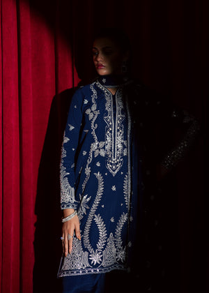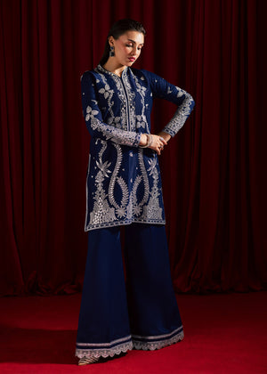 Gul dazzles in a majestic navy blue hue, adorned with intricate embroidery and hand picked pearls, stones and sequin waves that sparkle with every movement. Chiffon dupatta serving festive fashion celestially with its appealing deep blue color and glinting adornments. Paired with sharara pants featuring wide hem border perfect for making a statement at formal occasions.