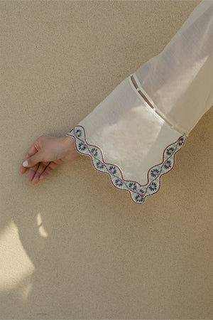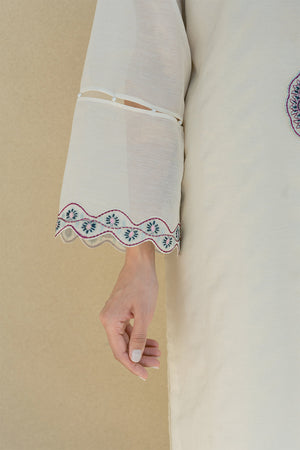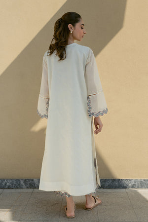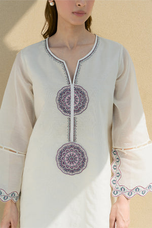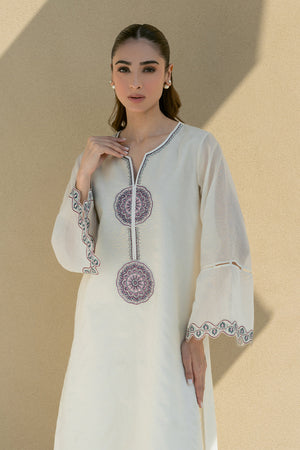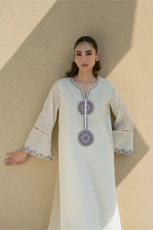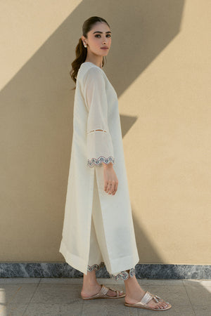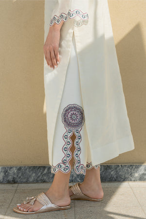 Make a chic impression with our stunning pristine pearl white ensemble, beautifully adorned with intricate embroidery on the neckline and izaar. This timeless piece is ideal for any event or special celebration.