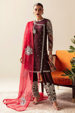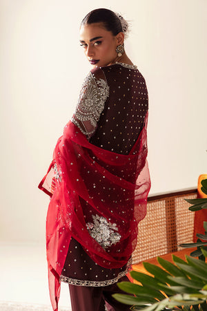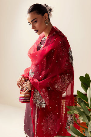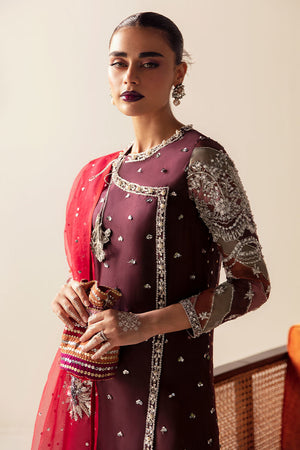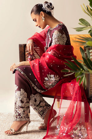 The Gulab outfit is mix of Plum Maroon and Red. This magnificent outfit has an organza front-closed shirt which is delicately hand-embellished in the luxury angrakha style. Featuring its tempting multicoloured chata pati pattern, form-fitting embroidered sleeves, and air of refinement, the shirt exudes grace and charm. The pleated shalwar adds an aura of sophistication and delicacy to the outfit with its lavish hand-embellished border at the hem. A dazzling organza dupatta with delicately designs in metallic silver that cast an intense glow. Gulab is the pinnacle of timeless elegance and provides the perfect outfit to make a lasting impression.