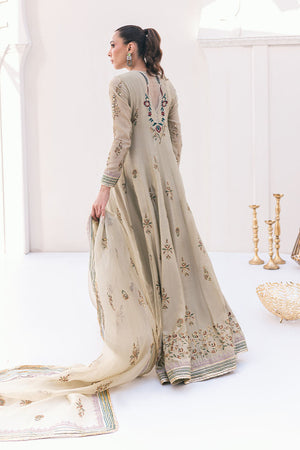 The "Gulbadan" ensemble in taupe green is a stunning display of elegance and artistry. The floor-length kalidar is crafted from khaadi net fabric and beautifully block printed with jewel tones of maroon and emerald green, creating a rich and vibrant look. Hand-worked gota leaf embellishments add a touch of luxury and sophistication. The neckline is intricately embroidered on the front and back, adding to the ensemble's beauty. Paired with straight raw silk pants and an organza dupatta featuring similar block printed motifs, this outfit is a true masterpiece of craftsmanship.