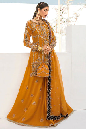 Its beauty speaks for itself, Gulkari is a radiant hue of mustard, which features a fully hand worked embellished, on a raw silk canvas. The heavily embellished short shirt shines with gold sequins, crystals & gotta work, adding hints of patchwork of purple velvet. The attire is paired with sharara pants, which has an eye-catching hint jewel like motifs all over it. The statement piece outfit completes its look with matching organza base dopatta with embelished velvet border all around.The shipping charges for all articles barring Bridals are as follows: