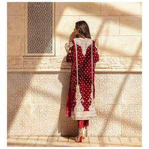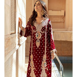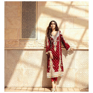 A beautiful shade of deep red velvet, with a variety of different hand embroidery techniques running along the shirt. Complete it with a stunning organza and velvet dupatta with intricate finishing along with straight rawsilk pants. This outfit is definitely going to be your favourite this winter season.The shipping charges for all articles barring Bridals are as follows: