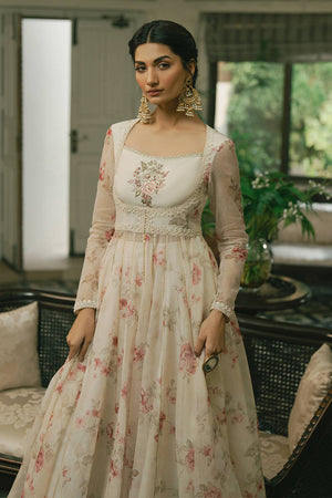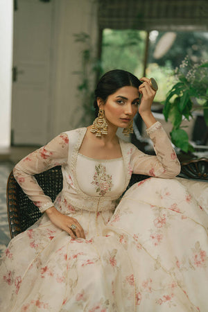 A kulla karandi peshwas in a soft white shade, featuring a printed floral overlay and a delicately embroidered floral bouquet on the chest. The skirt’s flare is framed by subtle gold-threaded embroidered borders. A cotton net shirt underneath, adorned with gota kinari and sitara trims, adds depth. A crushed paper silk dupatta, finished with gold tilla embroidery, completes this ethereal ensemble. Perfect for festive Eid evenings.
