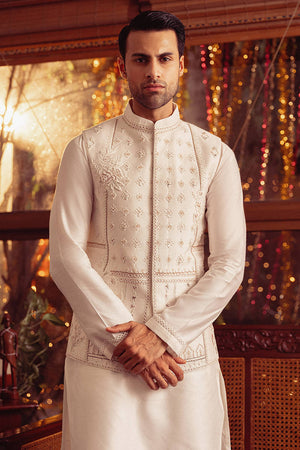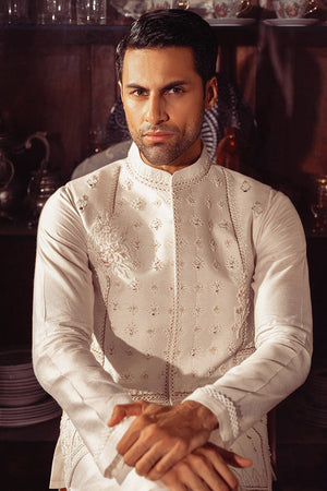The signature MNR "Hamdam" ensemble presents a captivating blend of tradition and sophistication. The waistcoat, crafted from a white cotton net, boasts intricate tonal white threadwork, which weaves an enchanting narrative of elegance. Adorned with glittering metallic accents, it exudes opulence fit for a groom of distinction. Paired with a white cotton net embroidered sleeves kurta and plain trousers, this ensemble showcases the allure of tonal embroidery on South Asian grooms wear, where subtle nuances of craftsmanship illuminate the path to sartorial excellence.
